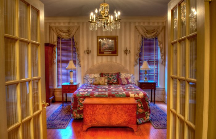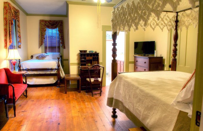 The house features four spacious bedrooms upstairs, each beautifully decorated with antique furniture and equipped with modern day conveniences, such as private bathrooms, televisions equipped with cable and DVD players, free wireless internet, desks, and miniature fridges. Downstairs, we have Sydney’s Suite, which has a large bedroom with a king size bed, a living room, bathroom, personal outdoor porch with a swing, and a dining area. Each room comes with a delicious hot breakfast for two and access to the house’s common areas.